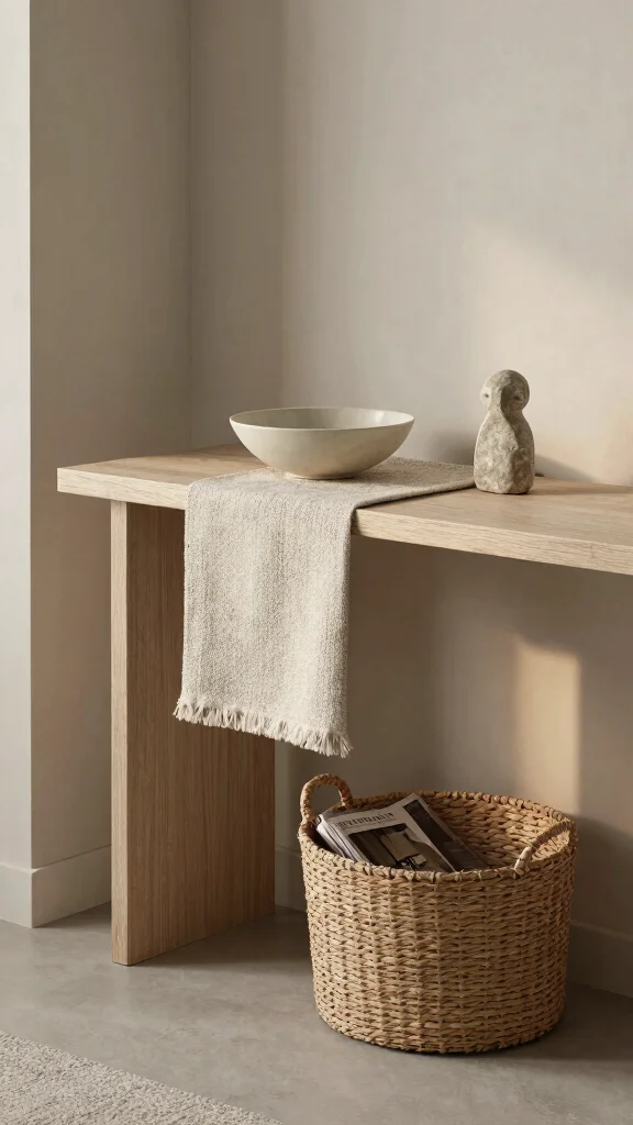 While your console table is a focal point, don’t overlook the floor space beneath it. This area can be creatively utilized for additional storage while maintaining a minimalist look. Placing a stylish basket under the table for hidden storage can help keep the area tidy and organized.