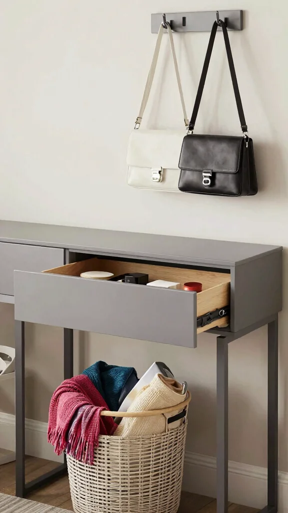 Incorporate hooks on the side for hanging lightweight items like bags or scarves. Positioning a slim storage basket underneath keeps the table surface clean and clutter-free.