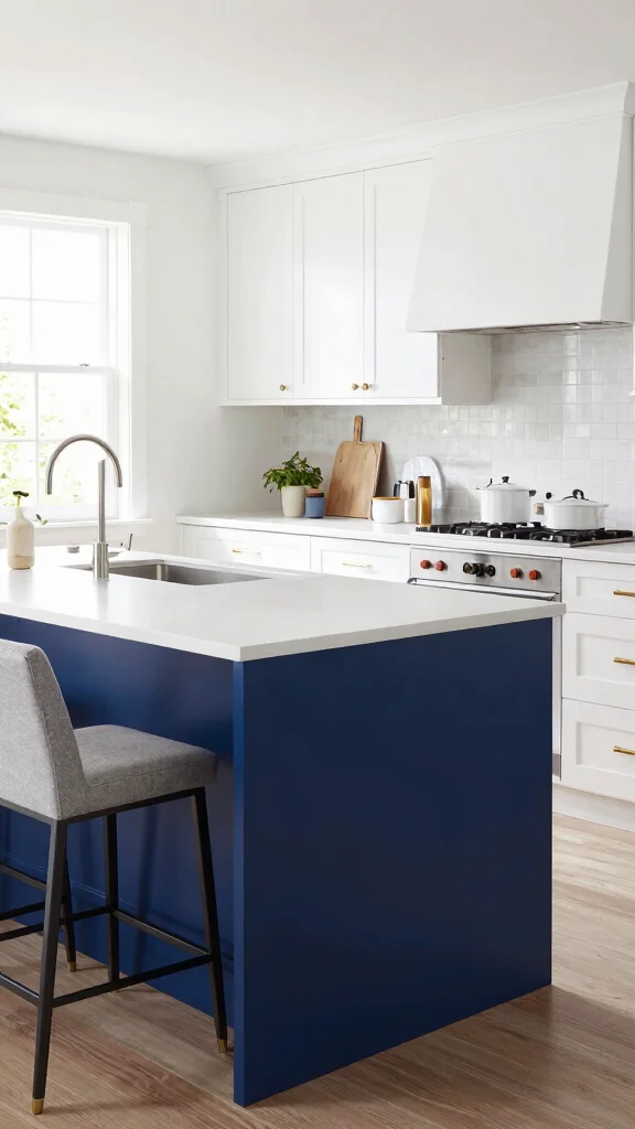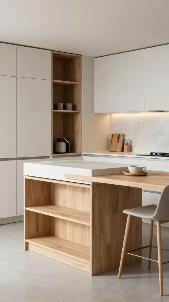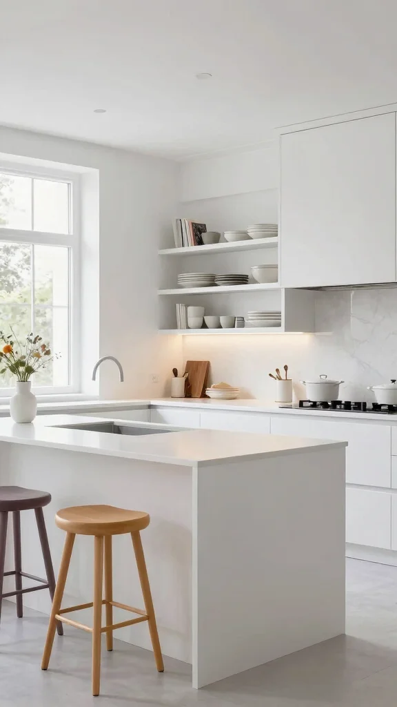 Embracing a sleek white minimalism in your kitchen creates a serene and sophisticated vibe. A white kitchen island stands out beautifully against darker cabinetry, serving as a striking focal point that invites warmth and elegance into the space. The simplicity of white surfaces allows for easy accessorizing; think colorful bar stools or decorative accents for a lively touch. Incorporating floating shelves above the island provides an ideal spot for showcasing beautiful dishware or cherished cookbooks, adding personality and charm.