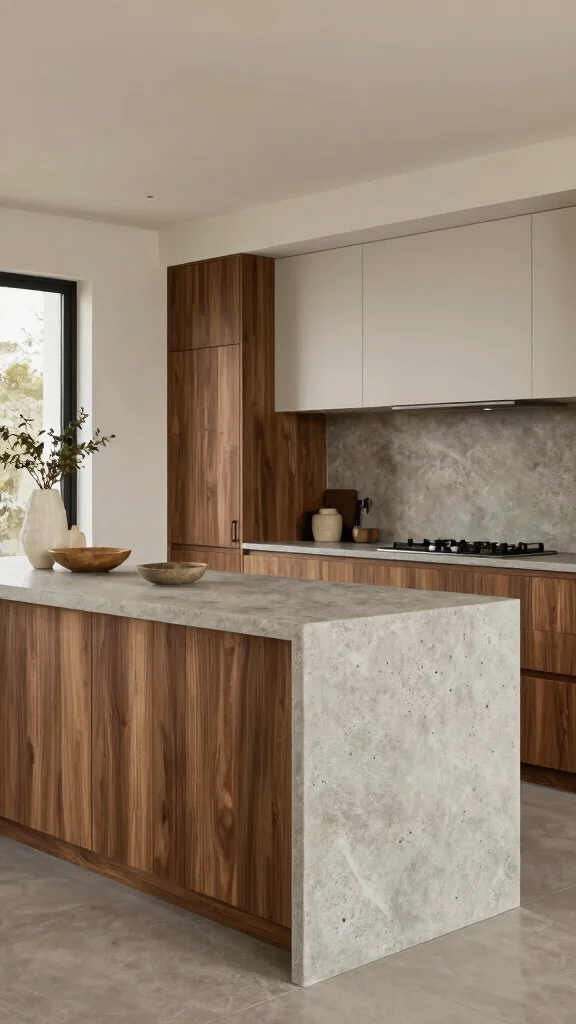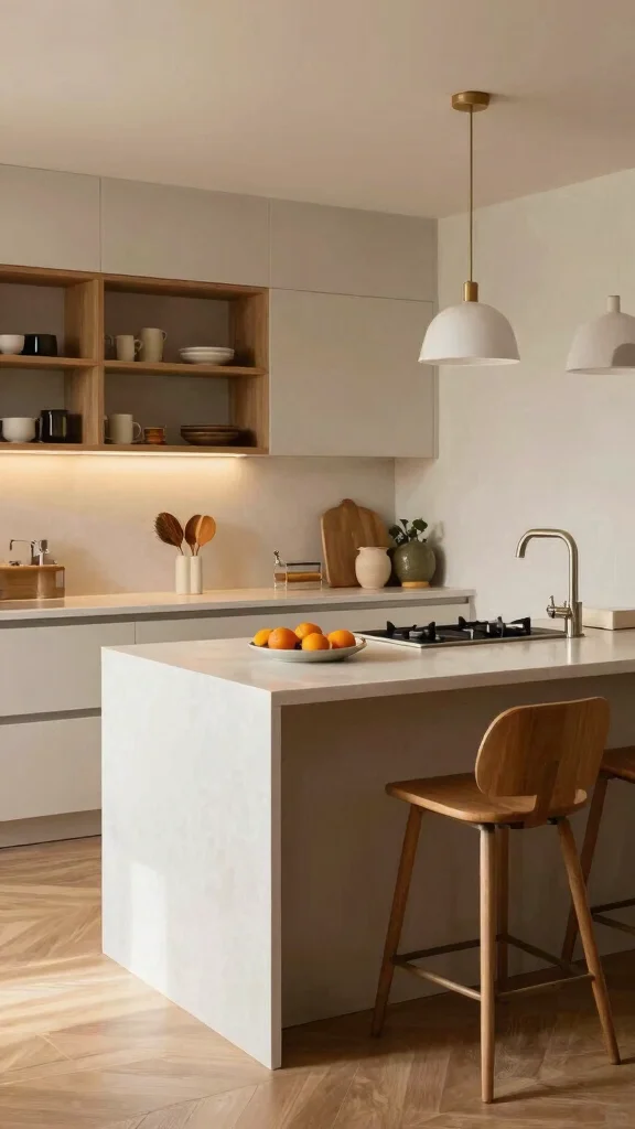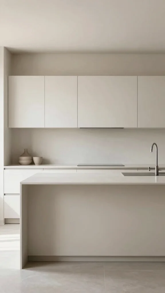 For a modern minimalist look, choose flush, handle-free cabinetry and a seamless countertop that runs to the edge (waterfall). Use a monochrome or soft-neutral palette and durable materials like quartz or concrete for modern kitchen decor with lasting appeal.