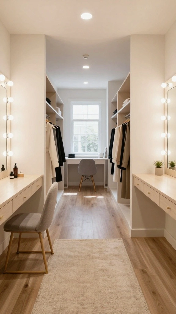 Combine overhead lights, task lighting around mirrors, and ambient lamps for a well-lit environment. Dimmer switches can adjust the mood, making your dressing room suitable for both daily routines and relaxation.
