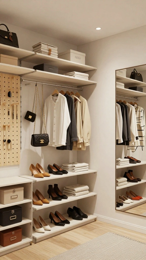 Implementing vertical storage solutions can be as simple as installing shelves at varying heights. Consider using decorative boxes to keep smaller items neatly stored while enhancing visual appeal. Embrace the trend of maximizing vertical space to create a stylish, organized dressing room.