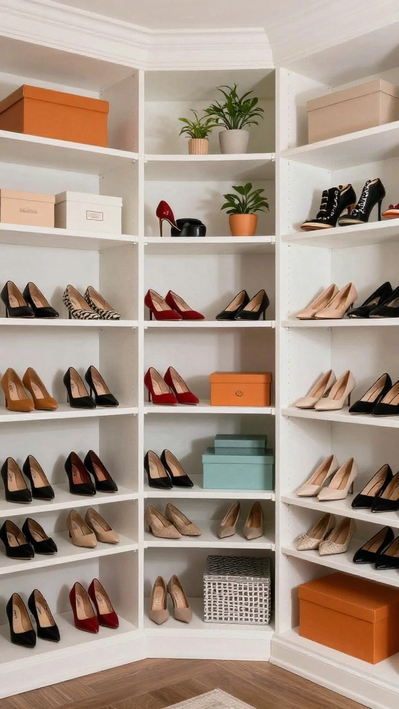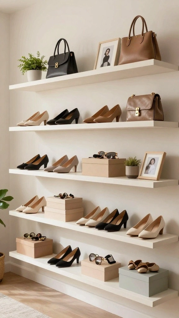 Floating shelves are a sleek solution for displaying and organizing your belongings without encroaching on floor space. These modern shelves can hold shoes, bags, and decorative items, keeping everything within easy reach while adding a stylish touch. Arranging them at different heights not only optimizes your space but creates an eye-catching gallery effect.