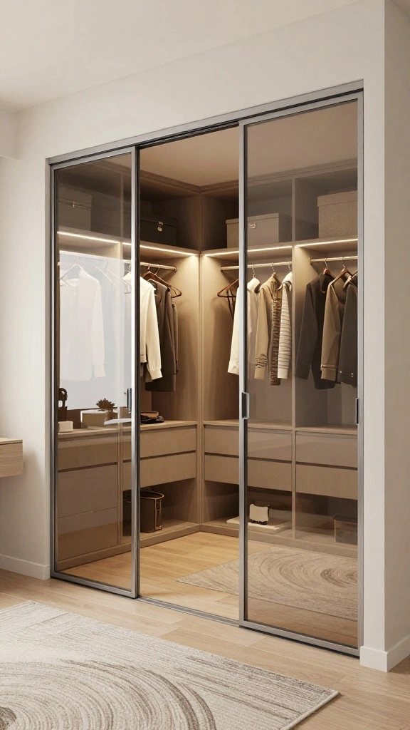 Choose light colors and reflective surfaces to visually enlarge the area, and use discreet LEDs under shelves for even illumination. Keep hardware minimal and organize items with internal drawers and adjustable shelves so everything has a home.