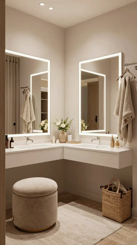 Lighting and colors are your secret weapons for maximizing small spaces. Start with a bright, neutral base—think whites, warm beiges, or pale grays—to reflect light. Add multiple layers of lighting: ambient ceiling light, task lighting by the wardrobe, and a mirror-lit glow for visibility.
