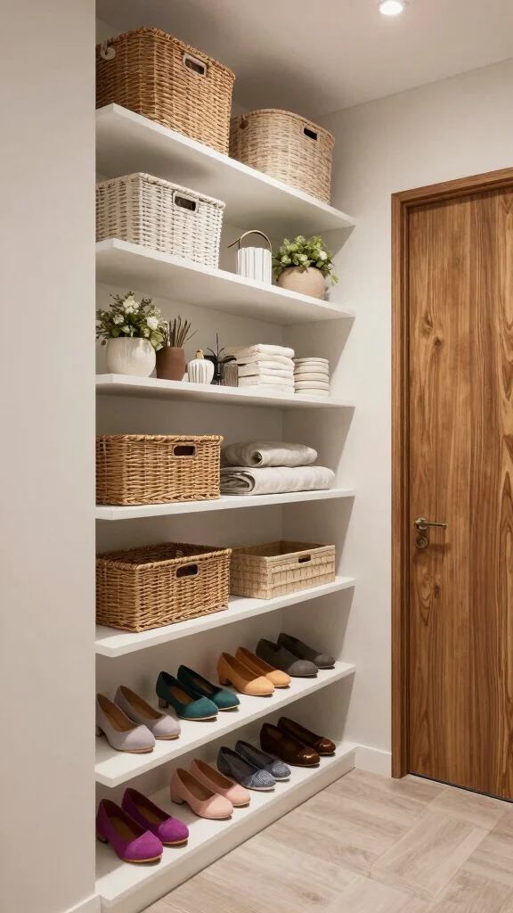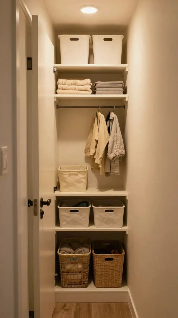 Start simple: declutter first, measure your shelves and clearance, then assign zones (daily essentials, seasonal storage, out-of-season items). Add slim shelves or a hanging rod to maximize vertical space, and use door organizers or baskets for small items. This approach aligns with hallway storage solutions and maximizing closet space, turning chaos into a calm, functional entry that supports home organization ideas.