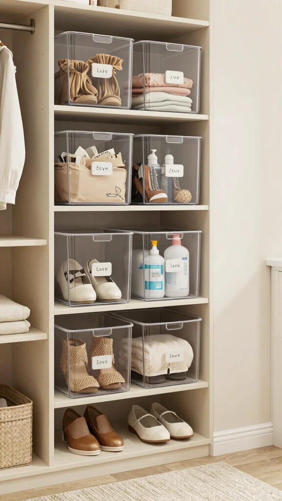 – Clear Storage Bins: Invest in clear bins for visibility of stored items, simplifying your search for shoes or seasonal gear.