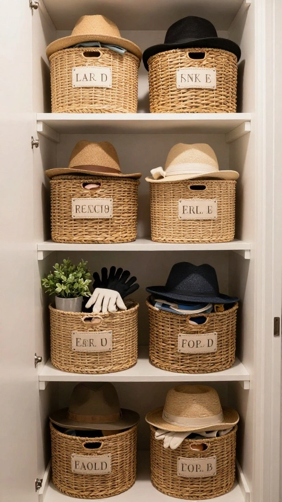 – Use decorative baskets to hold scarves, gloves, or other loose items.