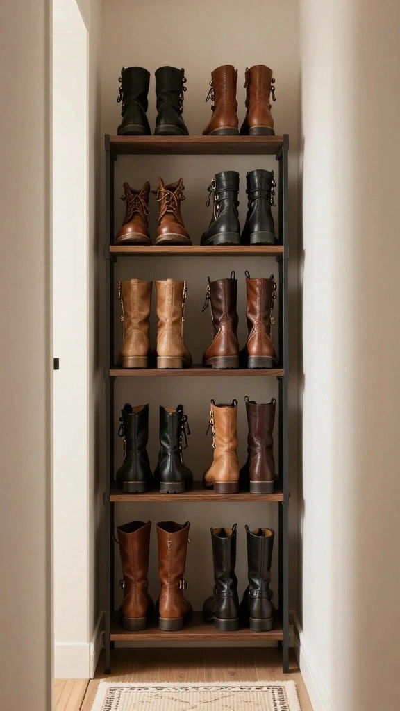 Look for a boot rack that fits your closet perfectly without overwhelming the space. Vertical boot racks can hold multiple pairs while conserving room; over-the-door options are also great for maximizing space.