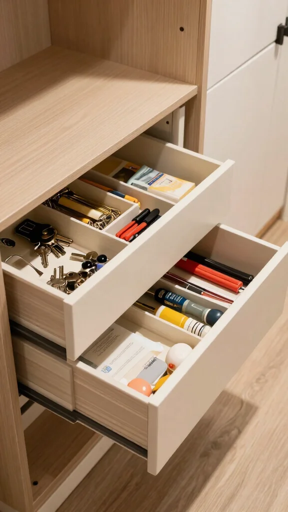 Small items can create chaos without proper organization, making drawer dividers a must-have for your hallway closet. If you have a drawer, adding dividers will help keep everything in place, from keys to batteries.