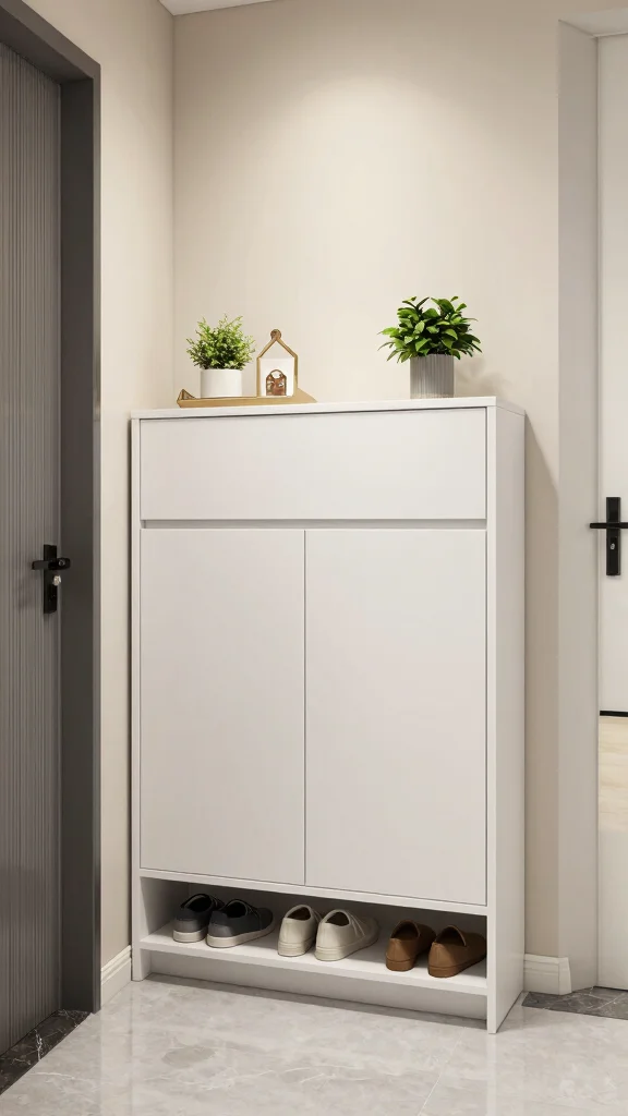 To enhance usability, choose cabinets with doors to keep shoes hidden from view, maintaining a clean look in your hallway. Many modern designs also incorporate slanted shelves for easy access, making it simpler to find what you need.
