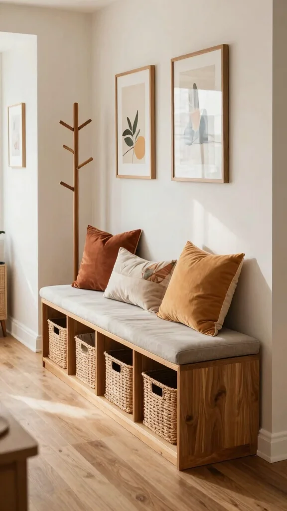This approach not only adds functionality with multiple storage options but also contributes to a warm, inviting atmosphere that makes your hallway a welcoming space.