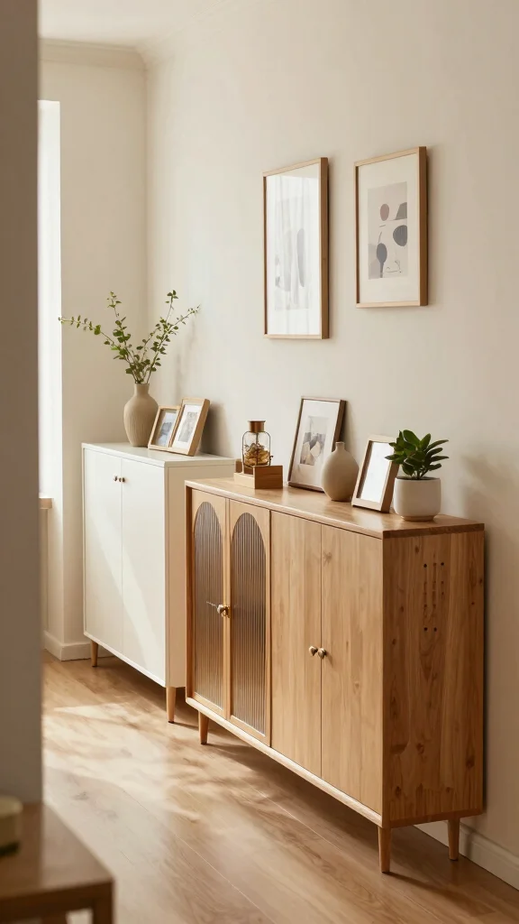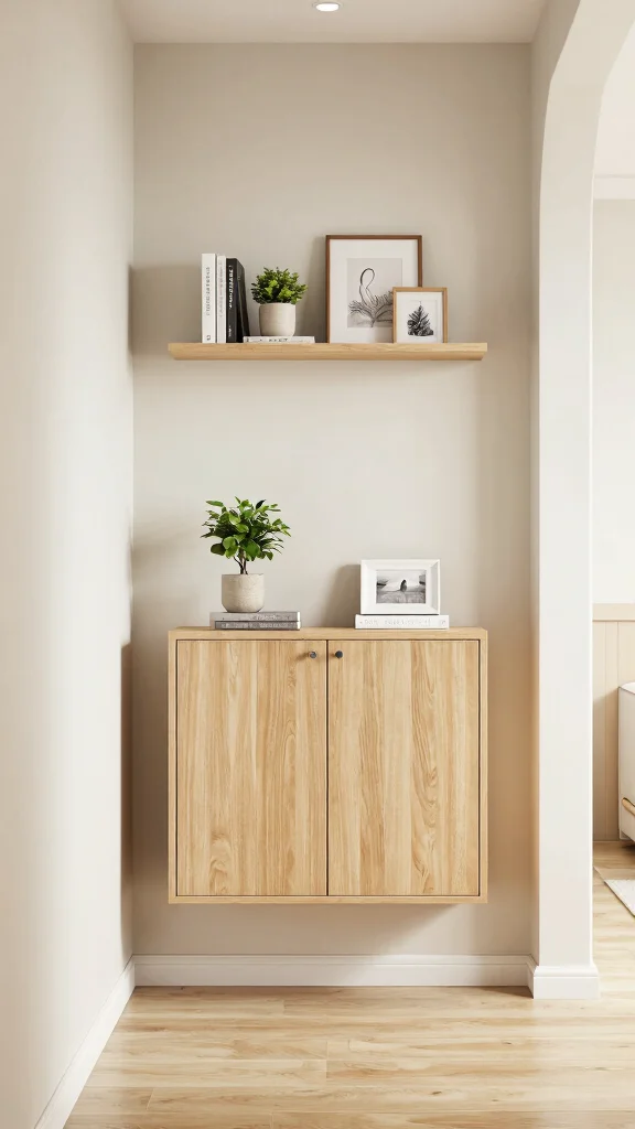 To maximize storage while keeping it visually appealing, consider combining wall-mounted cabinets with floating shelves. This creates additional display space while keeping items off the ground, making the area feel less cluttered. Compact designs are perfect for small hallways or apartments, offering a stylish solution.