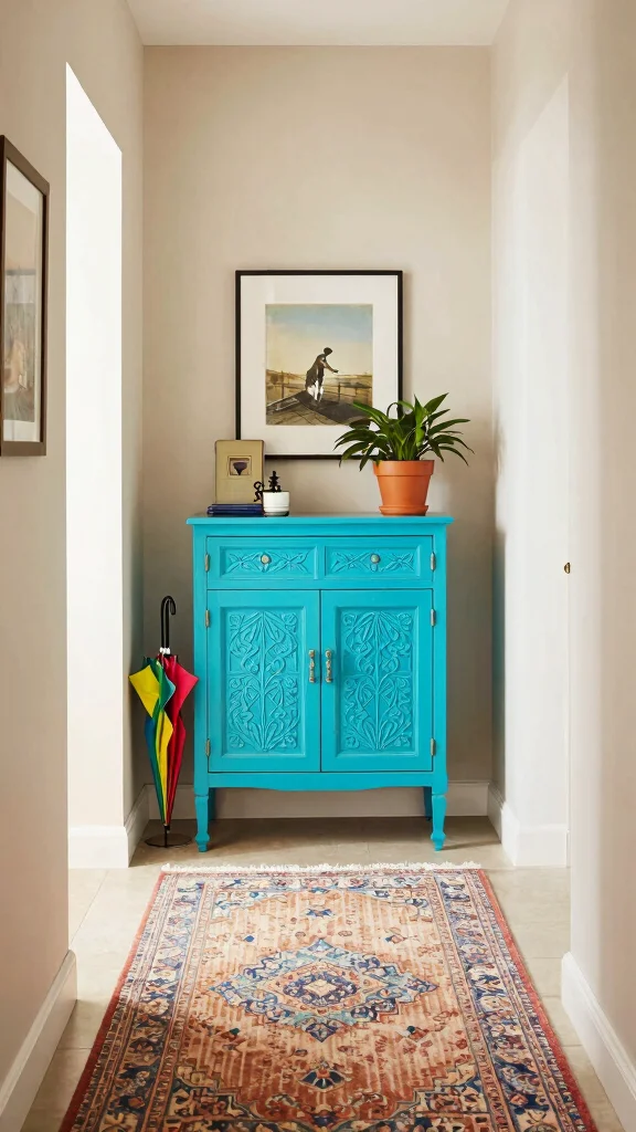 Infuse your hallway with personality using an artistic painted cabinet. These unique pieces serve as functional storage while doubling as canvases for your creativity. Select bold colors or intricate patterns that reflect your individual style, turning a simple cabinet into a stunning focal point in your hallway.
