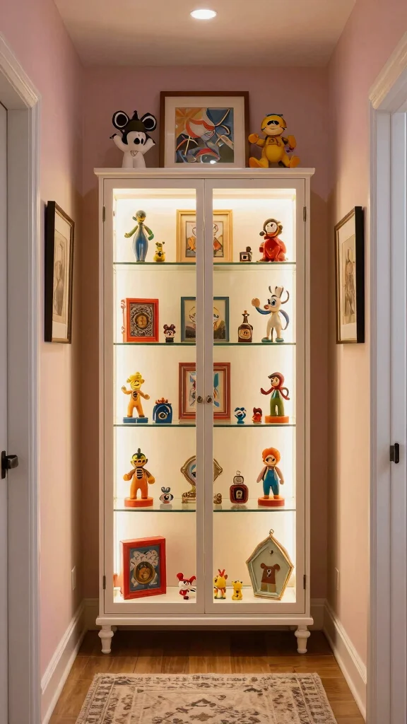 To maximize the impact of an artistic cabinet, consider adding built-in lighting to highlight your displayed treasures. Choose a design that resonates with your personal artistic taste, whether modern or vintage, to create a cohesive look throughout your hallway.