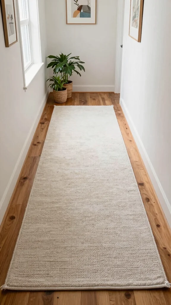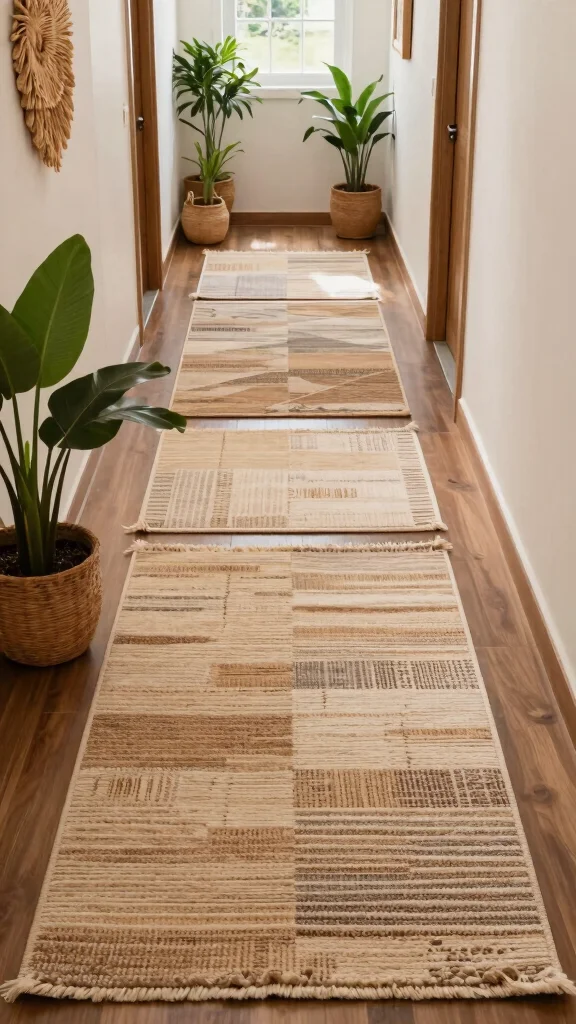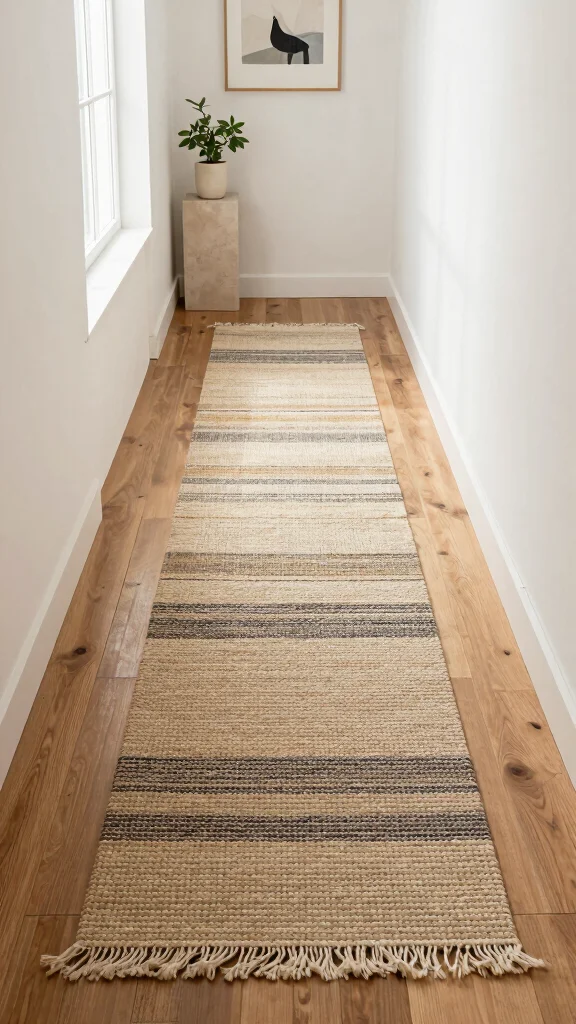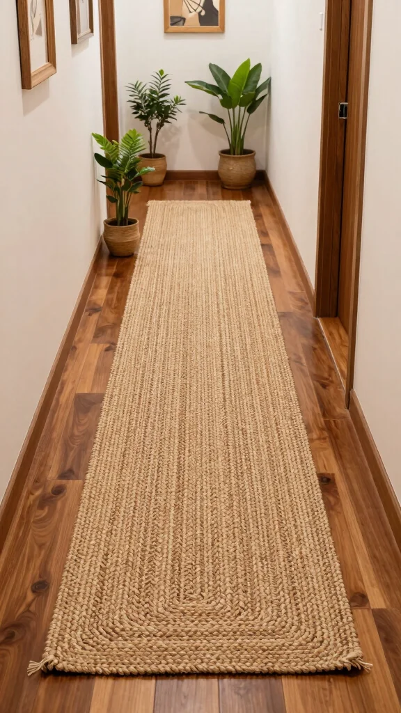 A jute runner brings natural charm to a narrow hallway—earthy tones meet warm textures. Pair it with soft furnishings or small potted plants for an instant boost to your long hallway runner’s style and coziness.