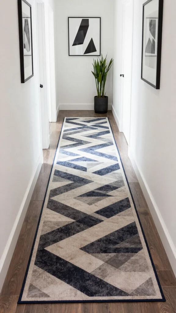 A geometric-shaped runner can bring contemporary flair to your hallway. Look for eco-friendly options featuring bold shapes and lines that create a striking visual effect. Imagine how the modern design of a geometric runner can add a chic and structured look to your narrow space.