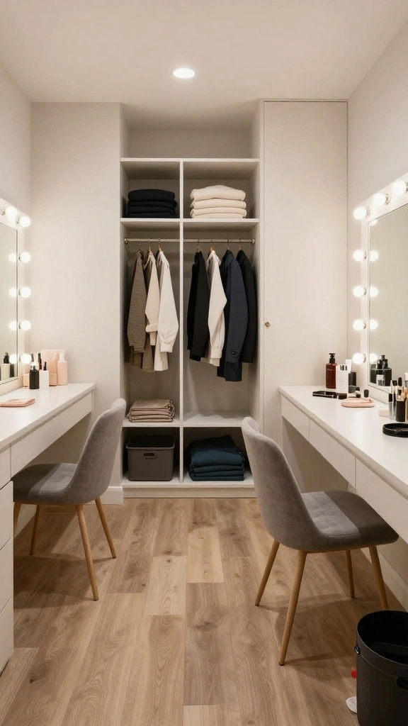 By thoughtfully arranging your layout, you create an inviting space that caters to your needs, making your dressing room a stylish and practical sanctuary.
