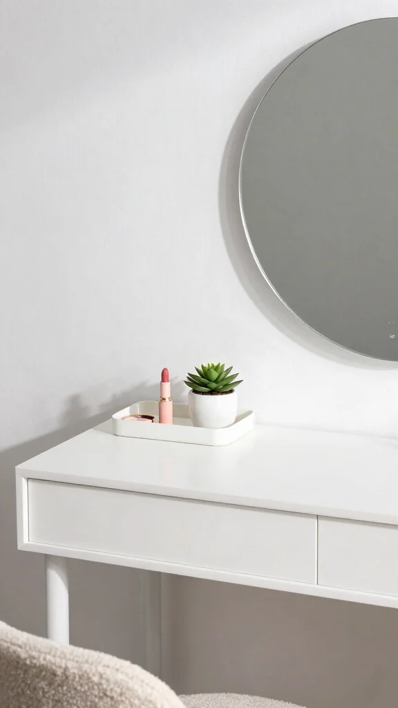 Incorporate a few essential beauty items, like a vibrant lipstick or a stylish perfume, to infuse personality while keeping the space uncluttered. The goal is a serene atmosphere that allows the vanity to be the focal point.