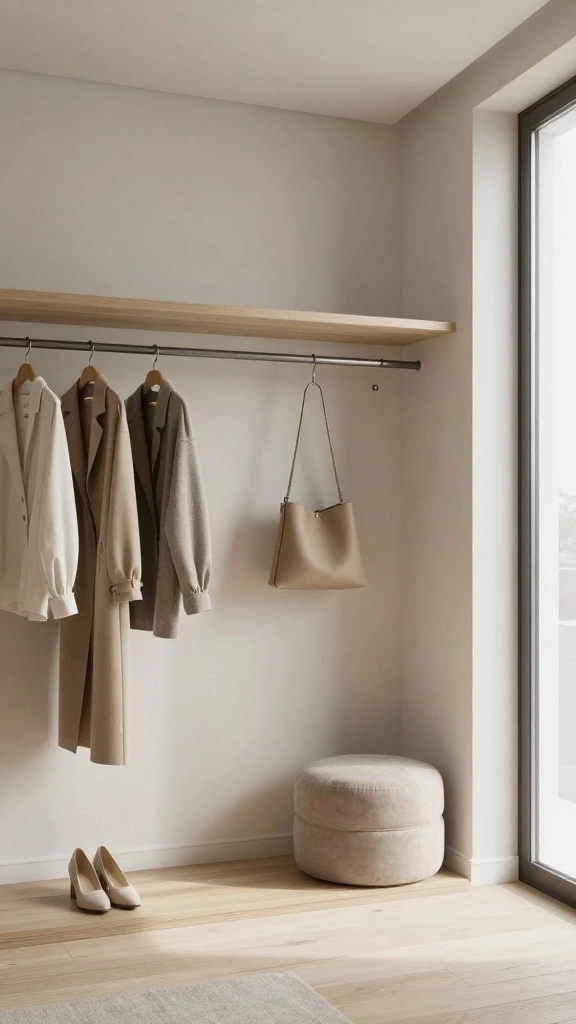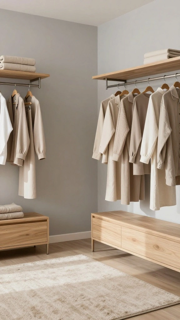 A neutral color palette lays the foundation for a modern, minimalist dressing room. Shades like beige, gray, and white not only create a calming atmosphere but also allow your clothing to take center stage in a serene environment. These colors foster a peaceful vibe that complements any style.