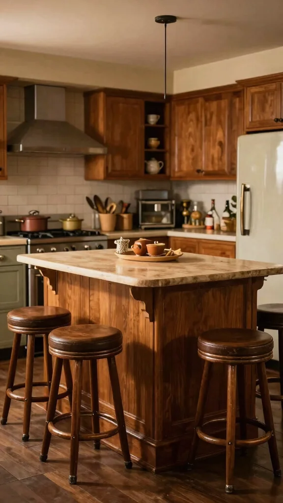 Look for islands with intricate details like turned legs and vintage hardware. Incorporating vintage stools can enhance the overall aesthetic and tie the look together.