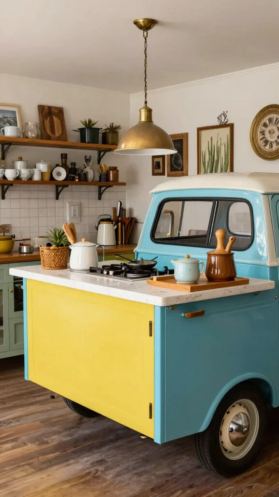 Ensure the truck is well-restored and clean for practical use. This design is ideal for homeowners who want their kitchen to tell a story while embracing fun and creativity.