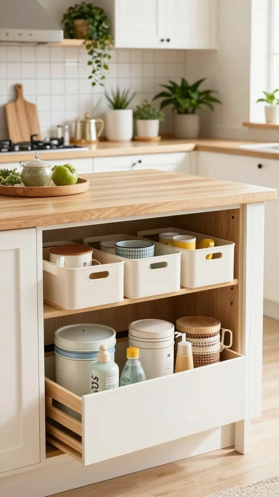 A kitchen island featuring built-in storage bins is a practical solution for those needing extra space to keep kitchen items organized. With drawers and bins, these islands help to maintain a clutter-free environment, providing easy access to everything from pots to linens.
