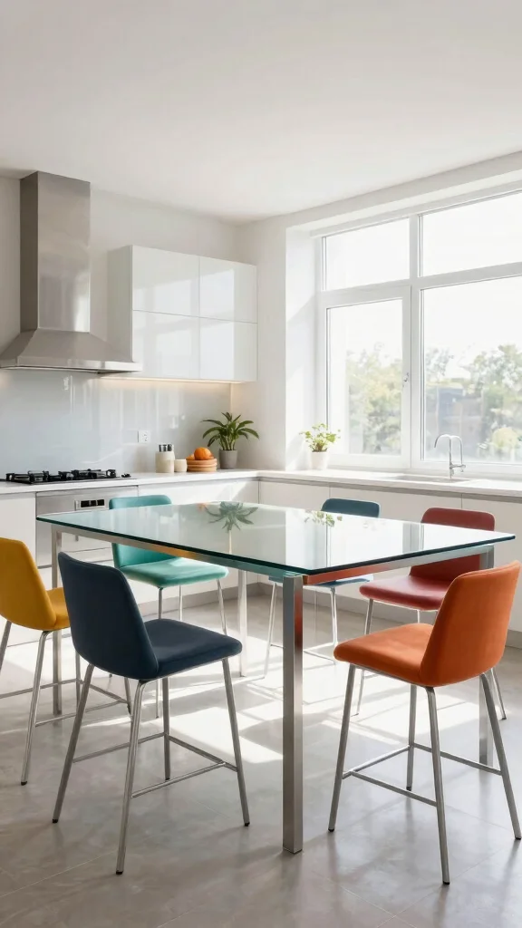 Pair your glass island with stylish metal or colorful stools for a contemporary edge. To add visual interest, consider incorporating decorative elements or plants beneath the glass surface.