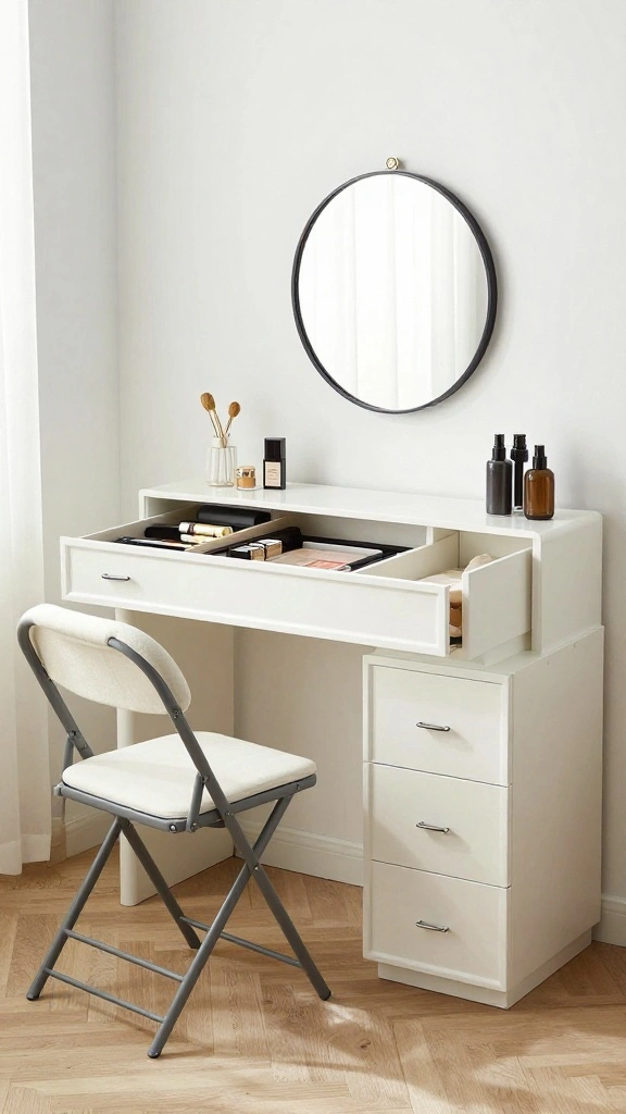 Create a multifunctional room design by pairing a compact vanity with a wall-mounted mirror and a slim desk that doubles as a makeup station.