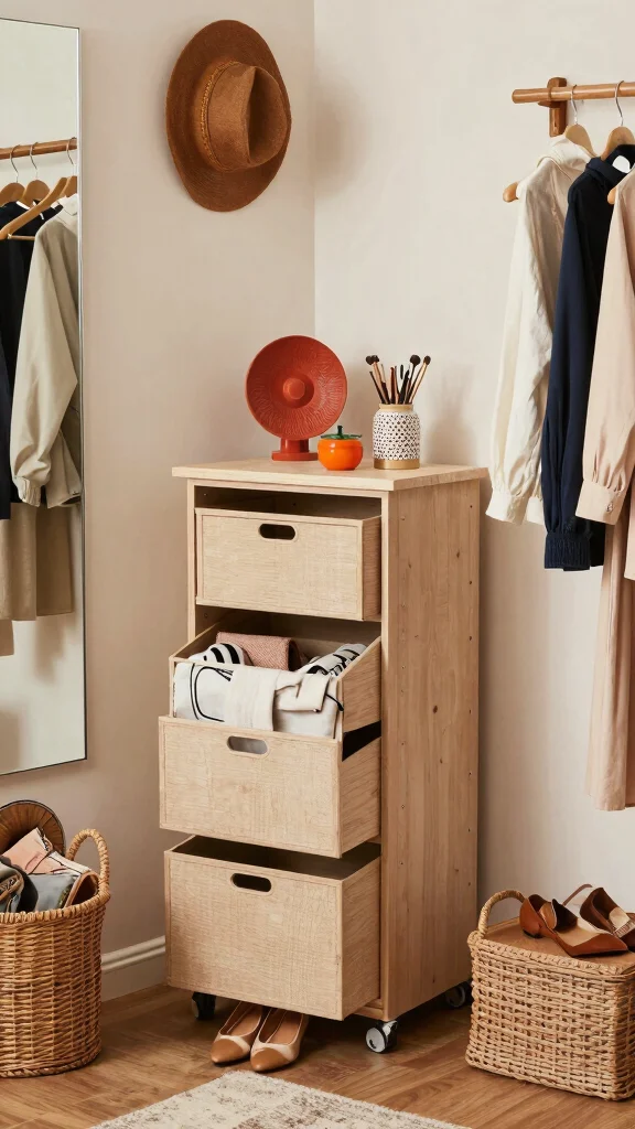Get a modular wardrobe or open shelving so you can see outfits at a glance, then use small space organization tactics like labeled bins and tray organizers.