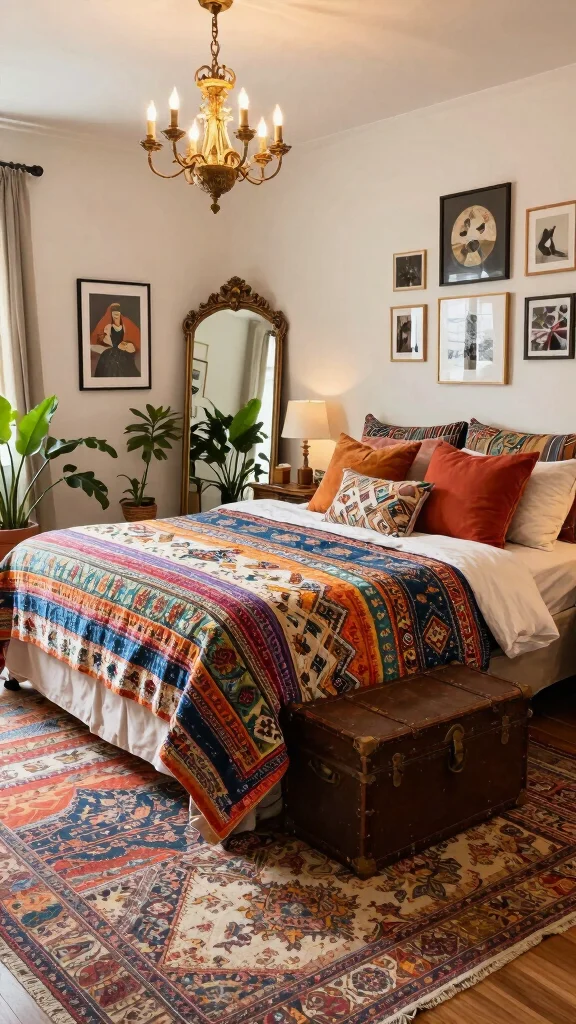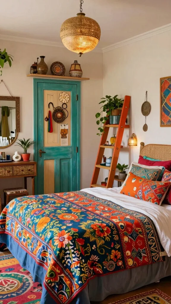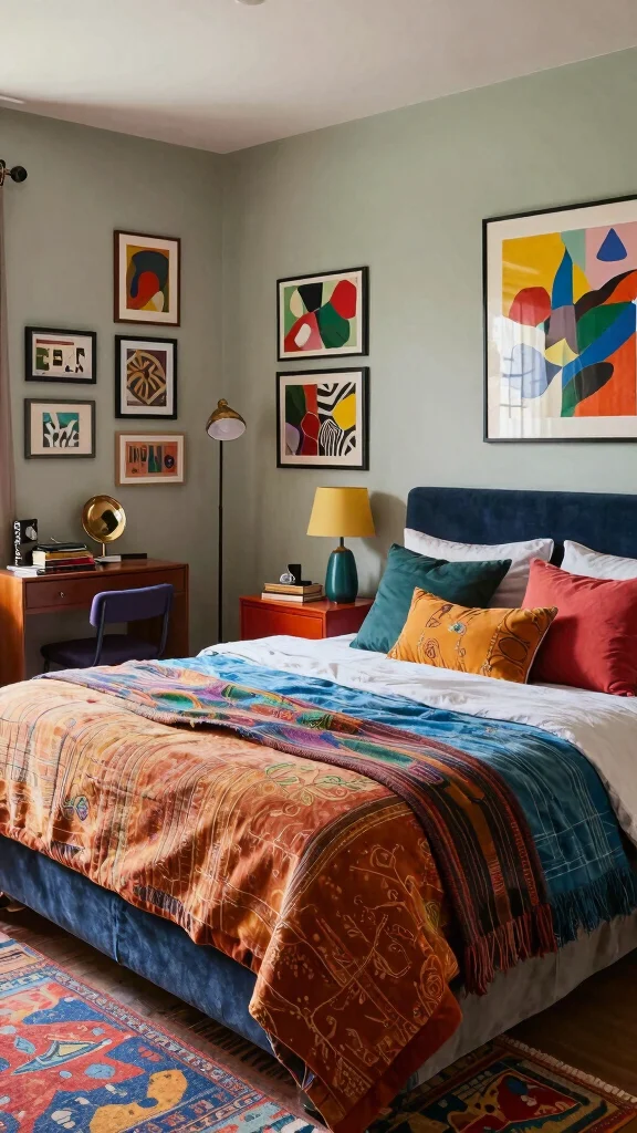 Combine bohemian style with artistic elements for a unique bedroom that radiates warmth and creativity. This aesthetic embraces a variety of patterns, textures, and colors, allowing for personal expression. Start with a bed draped in mixed patterned fabrics, layered with colorful throws that invite comfort.