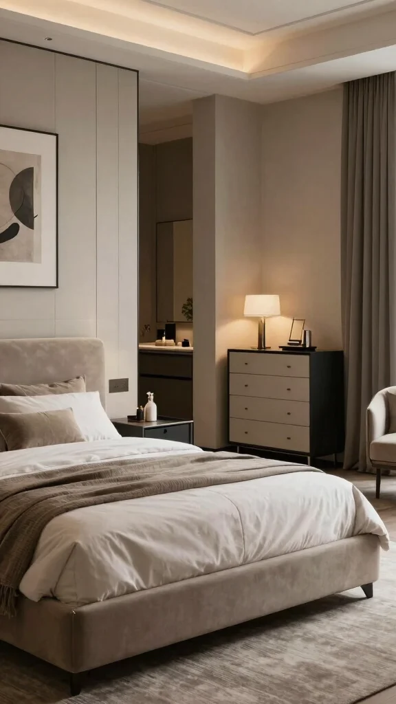 A sleek dressing area featuring a well-crafted dresser and soft lighting creates a serene escape. Emphasize minimal decor, opting for a few statement pieces instead of clutter.