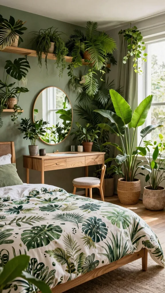 Transform your bedroom into an urban jungle where nature intertwines with modern living. Incorporating plants and organic materials creates a refreshing dressing space that invigorates the senses. Start with a comfortable bed featuring botanical-themed bedding, complemented by natural materials like wood and stone in your furniture choices.