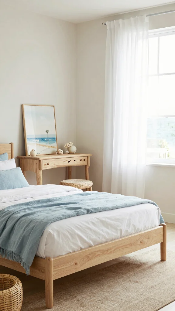 Bring the tranquility of the coast into your bedroom with a coastal-inspired design featuring a dressing area. This style focuses on soft hues, natural materials, and light textiles to evoke a beachy atmosphere. Start with a light wood bed frame paired with soft blue and white bedding that reflects ocean tones.