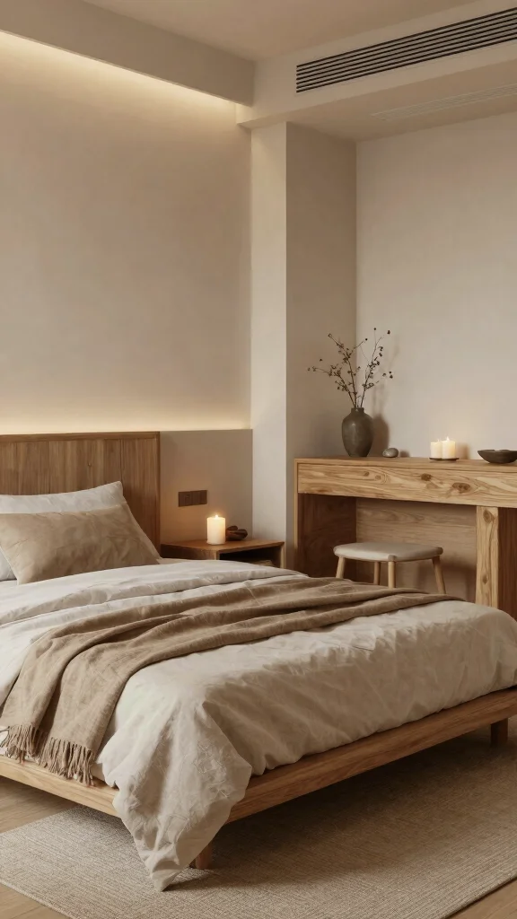 Incorporate a simple dressing area featuring a natural wood vanity and calming decor items like candles and stones, enhancing the overall zen experience.