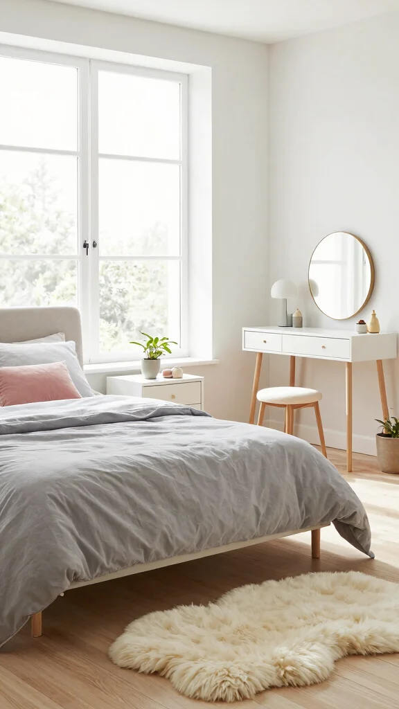 A simple dressing table paired with a round mirror can enhance the space, while a cozy sheepskin rug introduces warmth underfoot. Built-in wardrobes with open shelving allow you to display shoes and accessories, contributing both character and practicality.