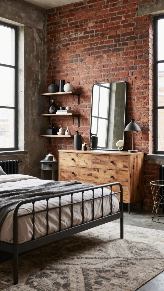 For the dressing area, consider a rustic wooden dresser and a metal-framed mirror, while open shelving displays your favorite accessories and personal treasures, offering an industrial twist.