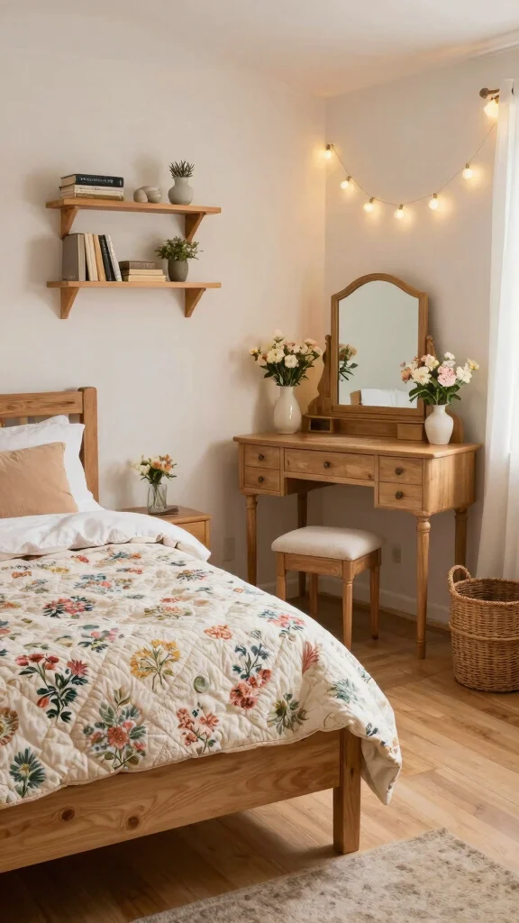 In a bedroom with dressing room, the cozy cottage vibe shines—soft fabrics, warm colors, and a vintage vanity turn mornings into a mini-retreat. Little details, like floral quilts and open shelves, make space feel larger and lived-in.