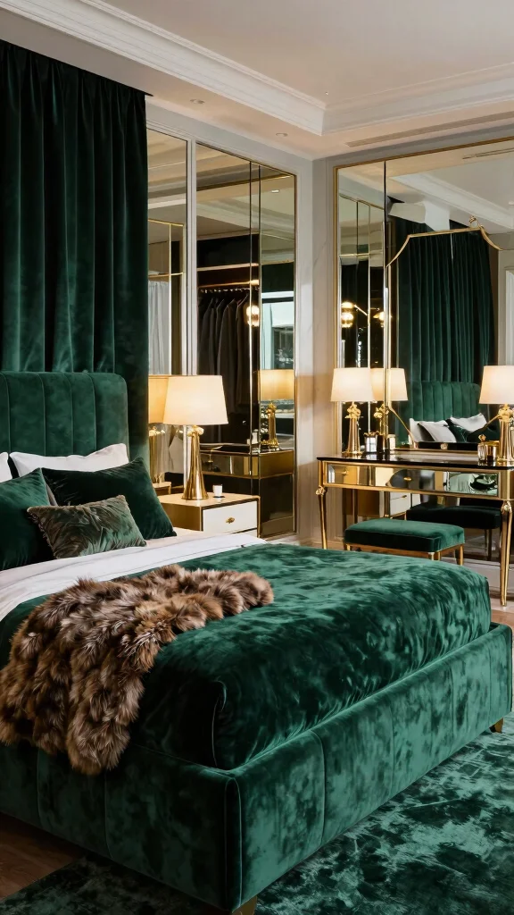 In the dressing area, consider a mirrored wardrobe and an elegant dressing table surrounded by plush seating, creating a sophisticated space. Soft lighting and decorative mirrors enhance the overall luxurious feel.