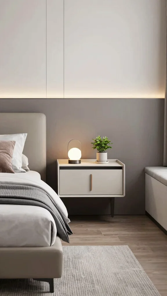 Floating nightstands are perfect for small spaces, providing surface area without occupying floor space. You can install them at varying heights to suit your preferences. Positioning them behind the bed offers easy access to essentials while maintaining a sleek look. Consider designs with built-in storage for added function.