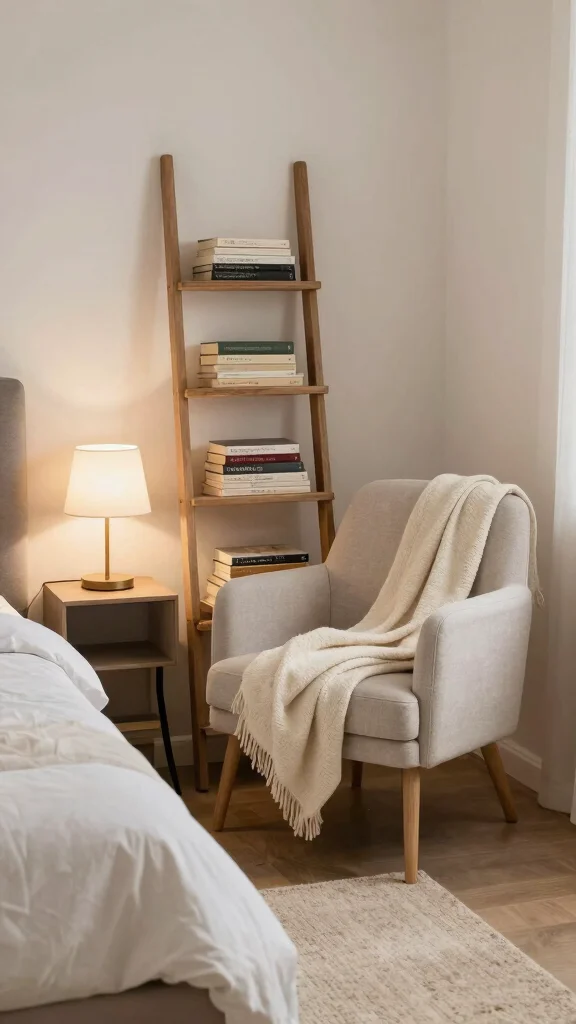 Transform the area behind your bed into a cozy reading nook! A small chair or chaise lounge creates a perfect little retreat for unwinding with a book after a long day. Include a small bookshelf or decorative ladder for holding magazines and novels. A soft throw blanket and side table with a lamp complete the inviting setup, offering a nice spot to relax.