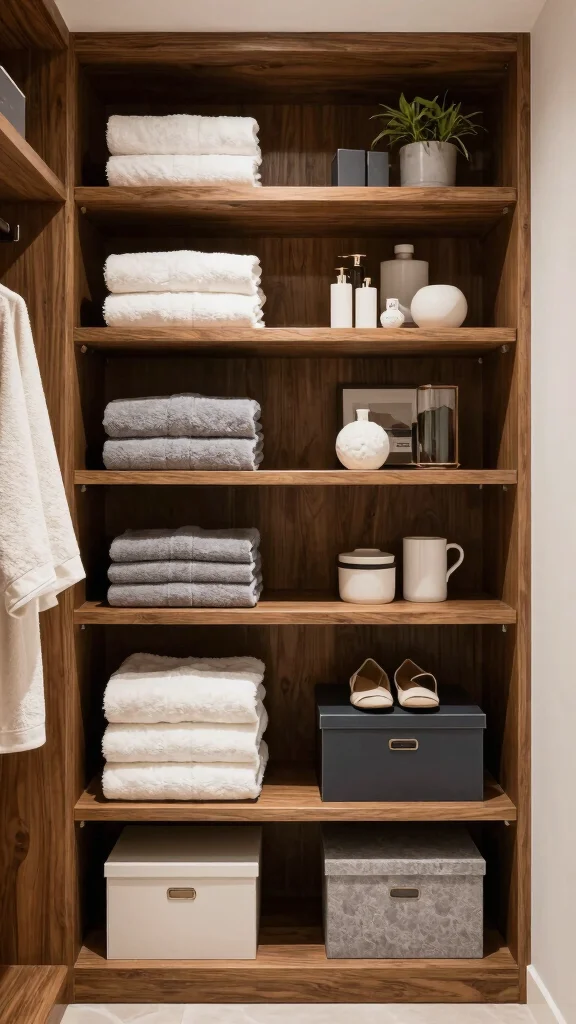 Chic open shelving is a stylish solution for displaying beautiful accessories while keeping your space organized. Use open shelves in your dressing room and bathroom to showcase items like towels, perfumes, or decorative boxes. Choose materials that blend with your decor—wooden shelves can offer warmth, while metal designs enhance a modern aesthetic. Maintain a curated look by organizing items and incorporating decorative baskets for smaller accessories.
