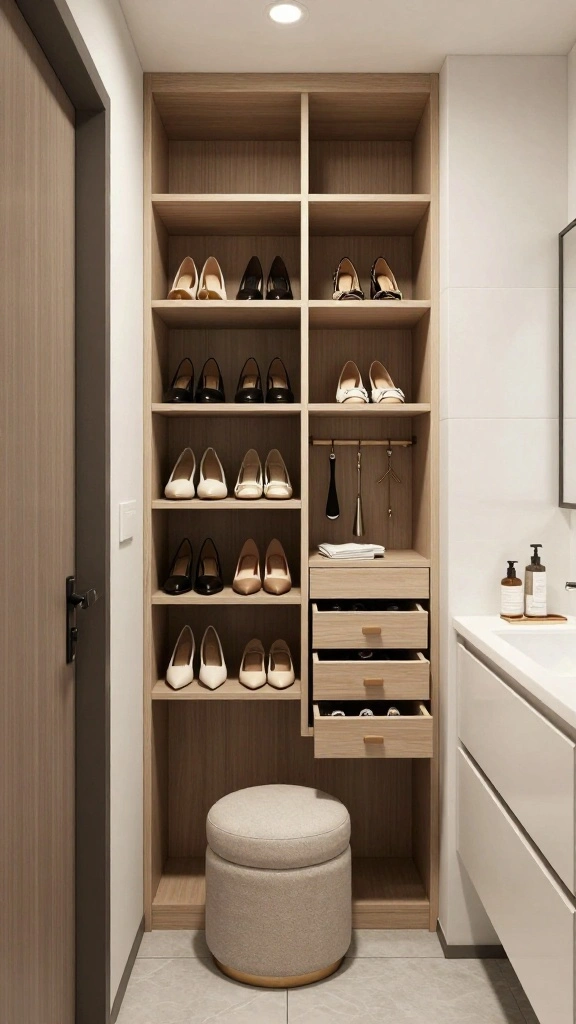 An organized space is essential in a dressing room with bathroom. Look for multi-functional furniture that offers storage. Consider built-in cabinets or open shelving for easy access to your items. Use bins and baskets for smaller accessories to keep things tidy. Make sure to include a dedicated beauty station with drawers for cosmetics and tools.