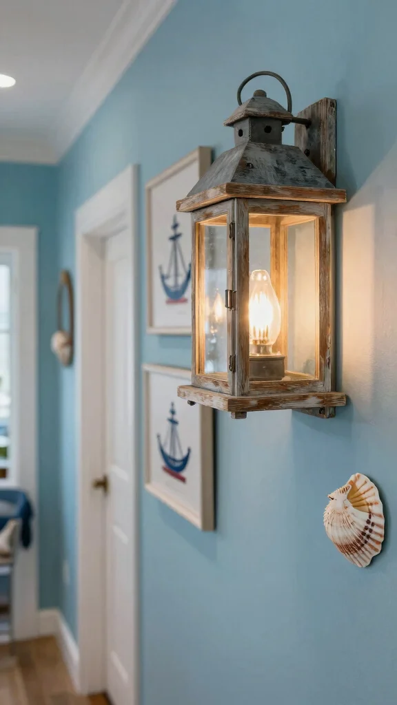 To create a cohesive look, consider pairing nautical fixtures with marine-themed decor or rustic elements that reflect your coastal style. Warm bulbs can enhance the cozy ambiance, making your hallway feel like a welcoming retreat.