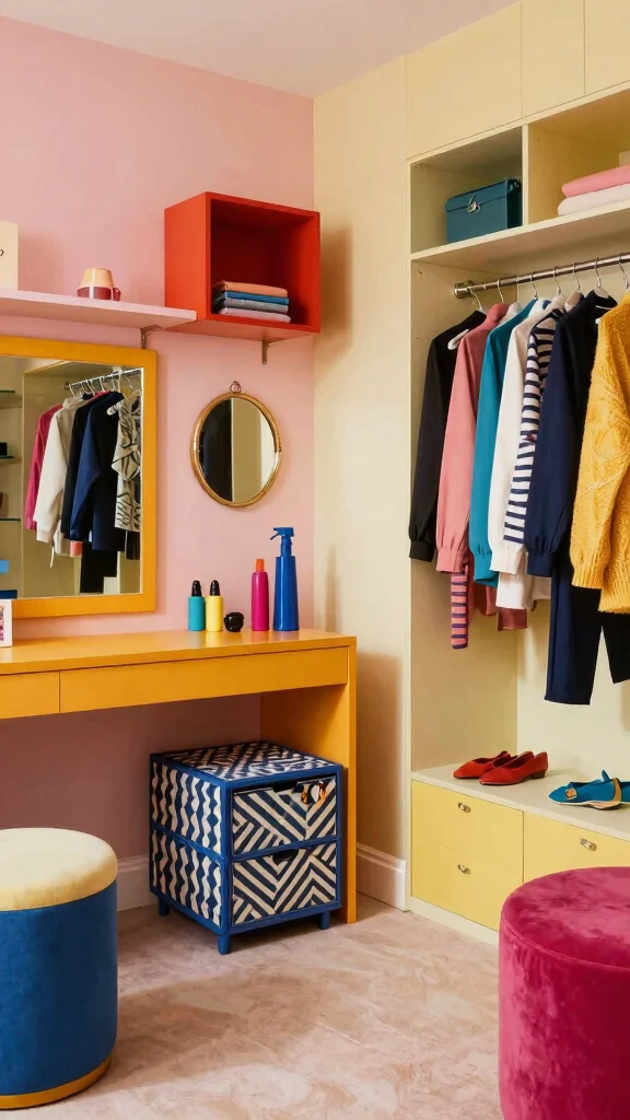 Use colorful accents through accessories or paint to create a vibrant, inviting dressing room.