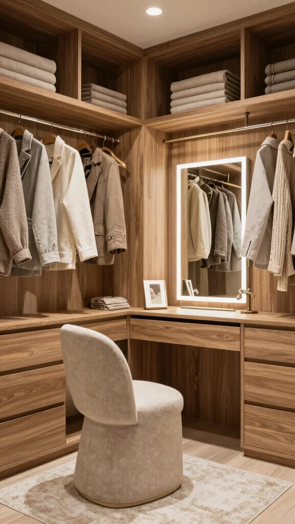 Layering rugs of different textures adds warmth underfoot, while incorporating plants breathes life into the design. Soft, twinkling lighting sets a relaxed mood for your dressing rituals, making the experience feel special. Let your creativity shine through in every detail.