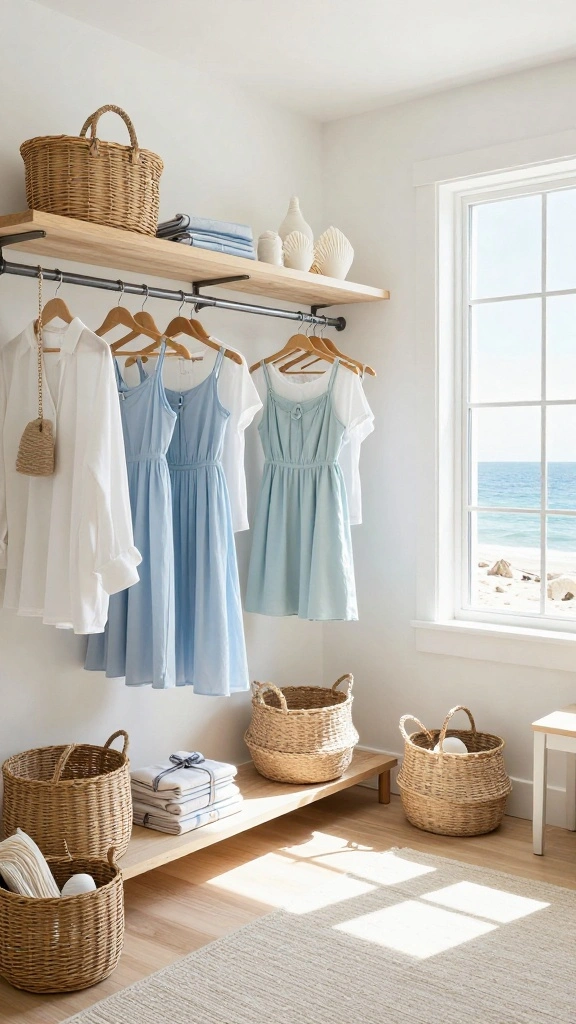 Open shelving displays your favorite light summer outfits, while sustainable baskets hold accessories in a stylish yet organized manner. Consider adding beach-inspired decor, such as shells and coral pieces, to evoke coastal vibes and remind you of serene beach days. Large windows or strategically placed mirrors can maximize natural light, brightening the space.