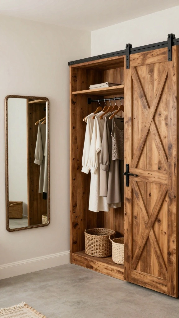 Incorporate vintage mirrors and barn-style doors for an authentic farmhouse touch, while plants add freshness and life to the design. Open storage allows for casual visibility of outfits, paired with small baskets to keep everything organized and tidy.