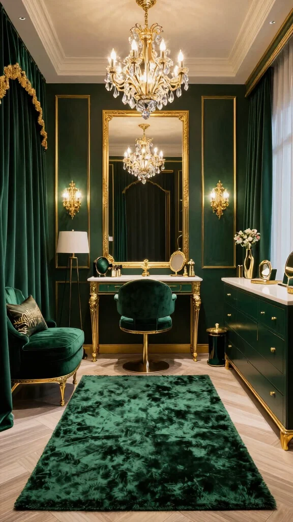 For those who relish in the finer things, a luxurious glam dressing room awaits. Rich colors like emerald green or royal blue paired with gold accents create an opulent atmosphere that invites indulgence. Plush rugs and velvet fabrics enhance the elegance, making the space feel sumptuous and inviting.