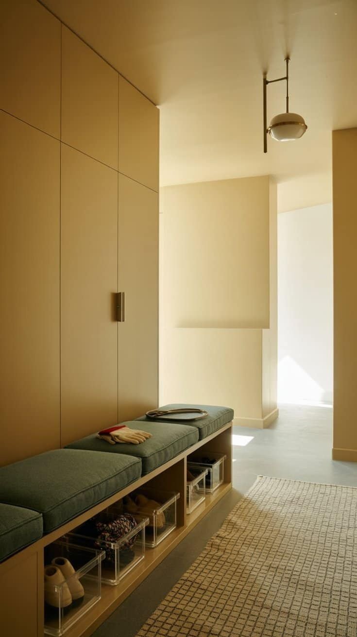 Features like open shelving for shoes and hooks for coats create a functional space without sacrificing aesthetics. Adding woven baskets can help keep small items organized.
